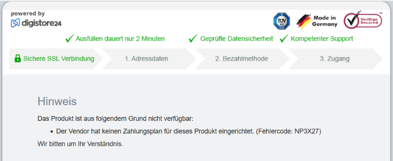 Wenn du beim Öffnen des Bestellformulars den Text "Der Vendor hat keinen Zahlungsplan für dieses Produkt eingerichtet." siehst (wie im folgenden Screenshot), dann hast du Schritt 4 ausgelassen bzw. den Zahlungsplan nicht richtig angelegt. Gehe bitte nochmals zurück zu Schritt 4 um einen Zahlungsplan einzurichten