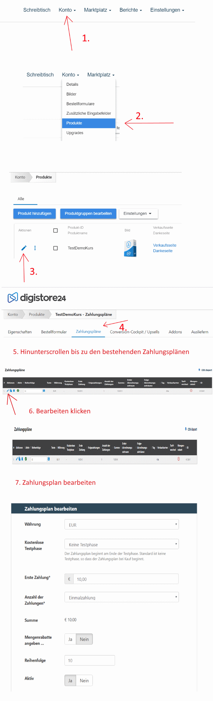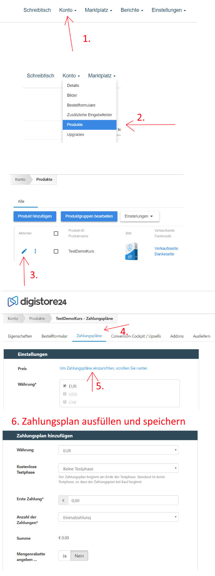 5) Zahlungsplan einrichten. Hier gibst du an wieviel dein Produkt kostet